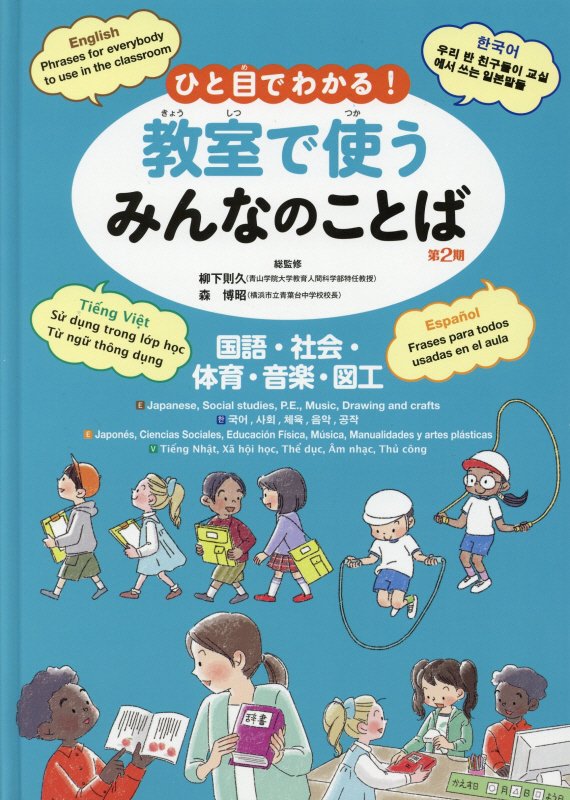 国語、社会、体育などの科目別に、外国人児童が日本の学校生活で必要となる日本語文例&言葉を、英語・韓国朝鮮語・スペイン語・ベトナム語の訳をつけて紹介する。日本語にはローマ字で読み方を併記し、漢字はふりがな付き。