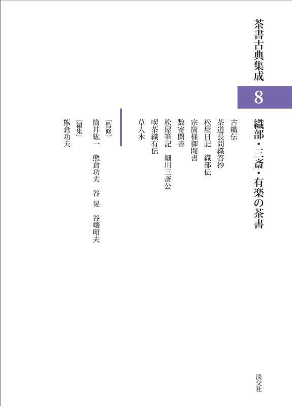 江戸時代末までに日本及び中国で書かれた、茶の湯を専門的に扱った茶書140余冊の原文を集成する。8は、千利休の武将の弟子である古田織部、細川三斎、織田有楽、上田宗箇が残した伝書を収録する。